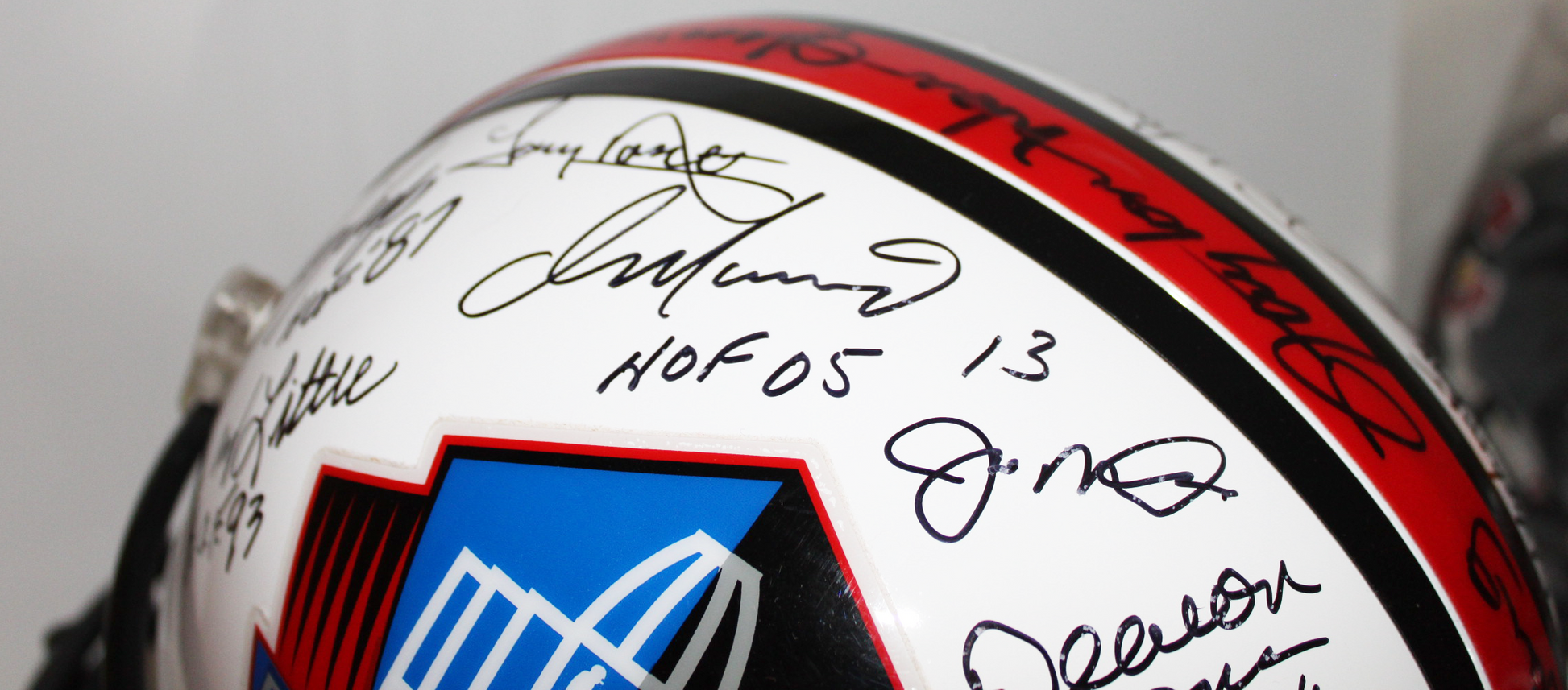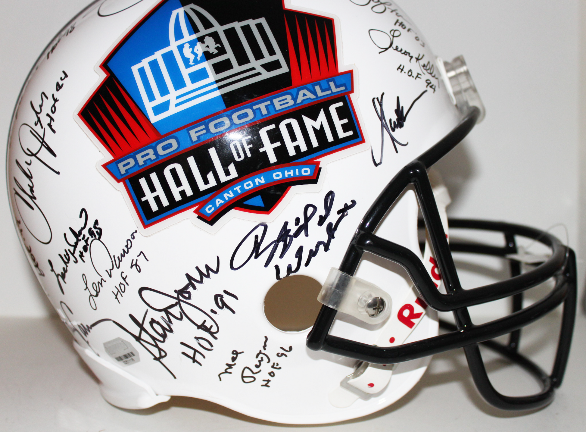 Hall of Fame Full Size Helmet Signed by 35, Jim Brown, Joe Montana, Dan Marino Holy HOFer Helmet, Batman! Chock-a-block with 35 black-Sharpie "8-10" signatures, this NM beauty also features many induction-year inscriptions. Includes: Jim Brown, Howie Young, Thurman Thomas, Steve Young, Don Maynard, Dick Butkus, James Lofton, Leroy Kelly, Mel Renfro, Stan Jones, Len Dawson, Lee Roy Selmon, Gale Sayers, Charley Taylor, Dwight Stephens, Larry Little, Jim Langer, Dan Marino, Joe Montana, Deacon Jones, Bob Griese, Jack Youngblood, Lawrence Taylor, Warren Moon, Mel Blount, Raymond Berry, Paul Krause, Anthony Munoz, Jim Kelly, Jim Otto, Harry Carson, Rayfield Wright, Tony Dorsett. Mounted Memories and Marino hologram stickers. Full LOA from JSA. Authentication - JSA, Mounted Memories