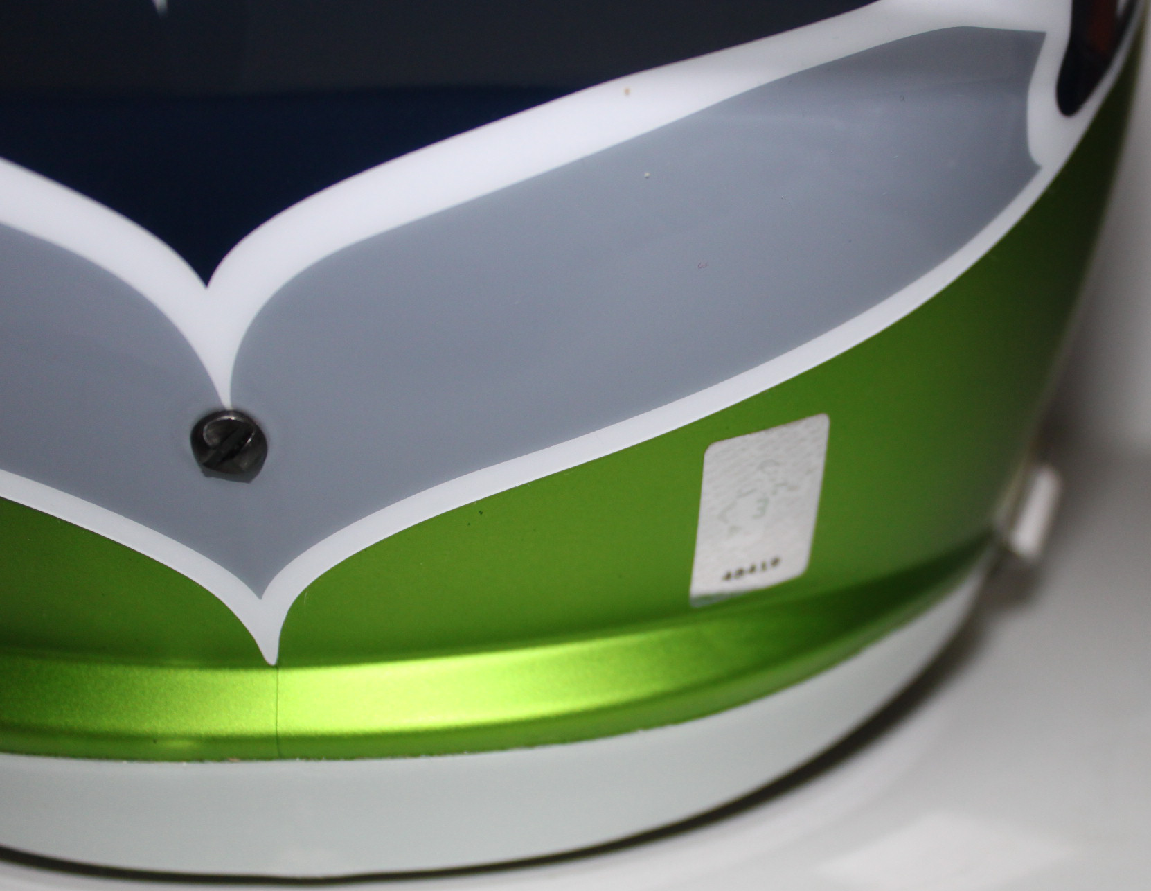Russell Wilson Seattle Seahawks Signed Blaze Full Size Speed Helmet Pictured is a Seattle Seahawks Riddell Blaze signed full sized helmet. It has been signed by former Seahawks star QB Russell Wilson. This hard to get helmet come with a tamper-proof Wilson player hologram and 3d bumpers, flag and NFL shield. Authentication - Russell Wilson player hologram