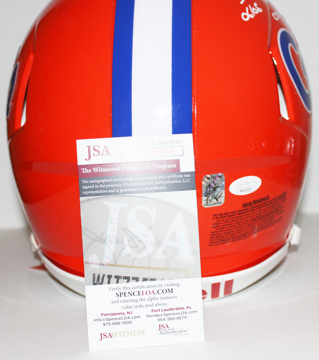 Tim Tebow Florida Gators Signed Riddell Full Size Authentic Helmet with Inscriptions - JSA Pictured is a Florida Gators full size Riddell Authentic helmet. It is signed by Gators great and Heisman trophy winner Tim Tebow. It comes with 2 inscriptions "06/08 Natl Champs" and "07 Heisman". It comes with a Tebow player hologram, JSA sticker and card. Authentication - JSA and Tebow player hologram