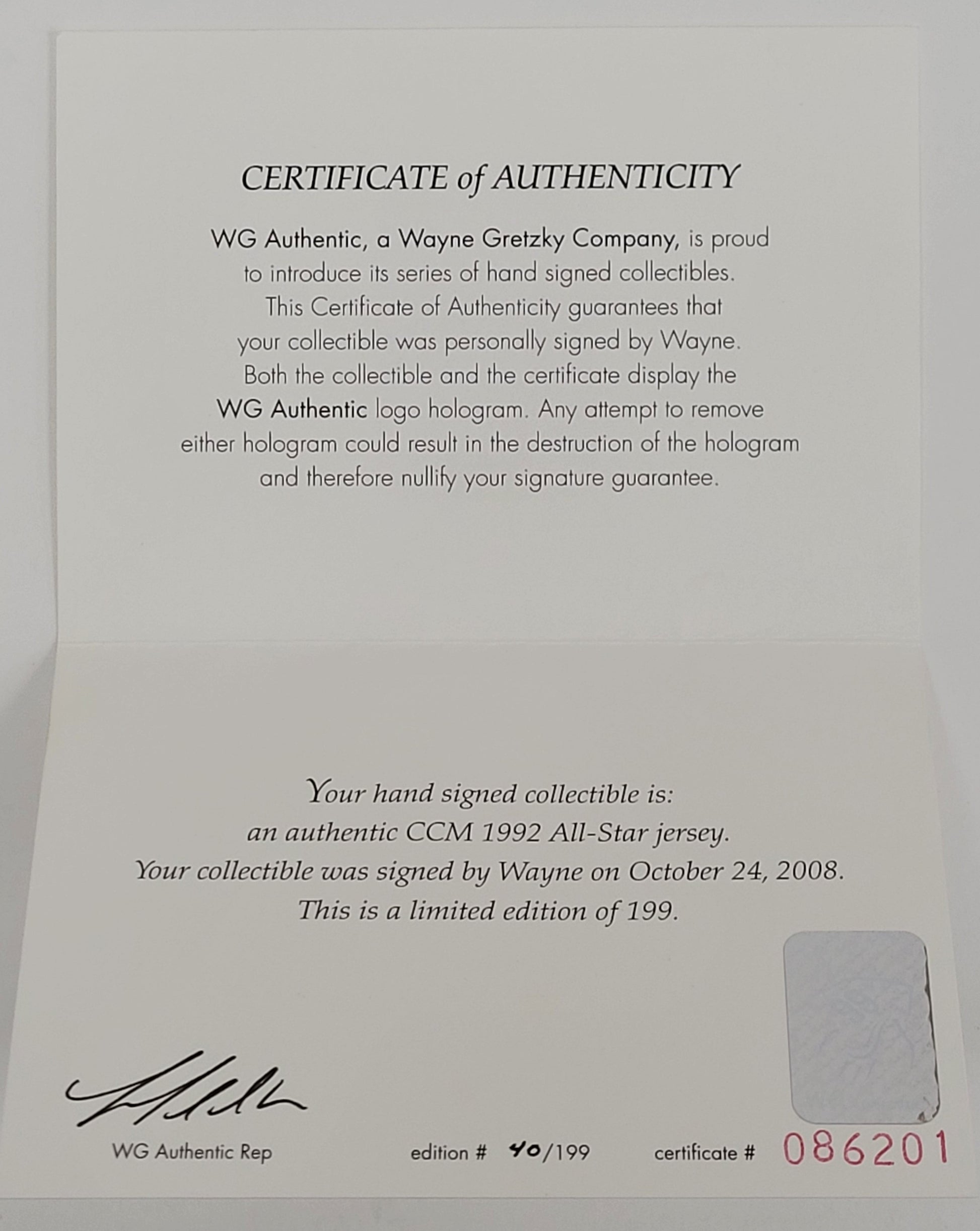 This is a Wayne Gretzky autographed & framed 1992 All-Star Game jersey signed in bold, black marker. This jersey is numbered 40/199. The frame measures 38x41, and the jersey can be removed from it upon the buyer's request. WG (Wayne Gretzky) Authentication.
