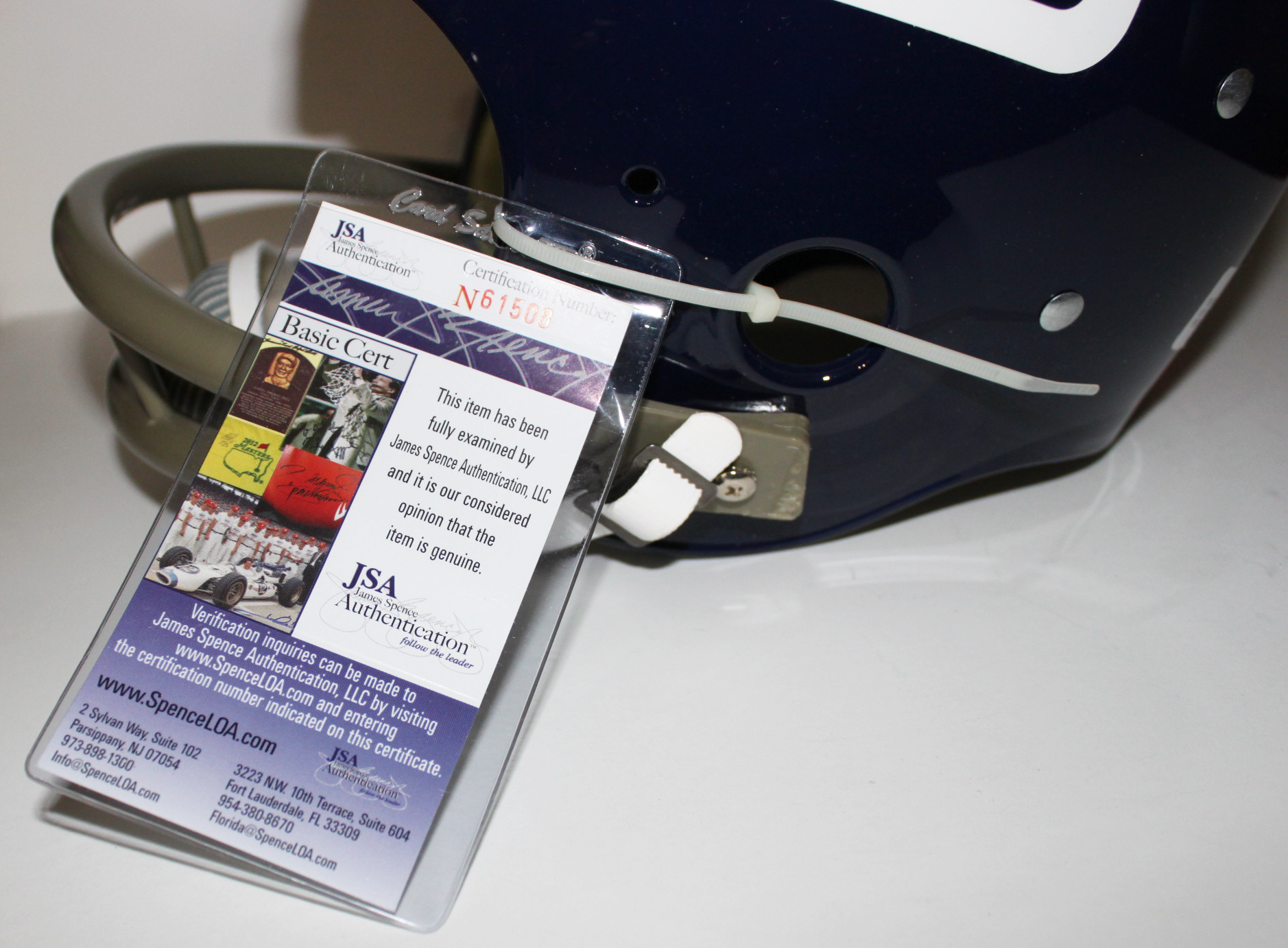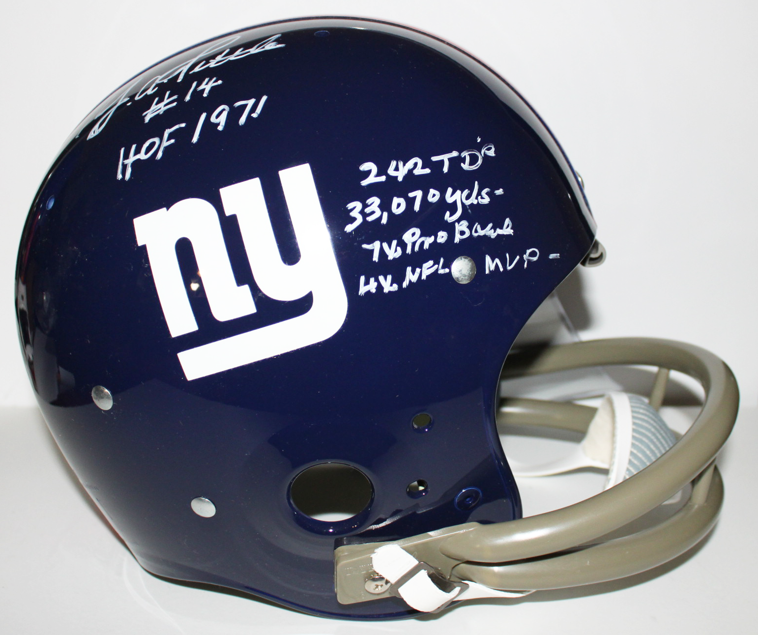 Pictured is a New York Giants Full Size RK 2-Bar Helmet signed by Giants, 49ers great and Hall of Famer YA Tittle. This RK style helmet is rare and comes with five Inscriptions, "HOF 1971", "64 Champs", "242 TD's", "33,070 yds"' "7X Pro Bowls" and "4X NFL MVP". Authentication- JSA